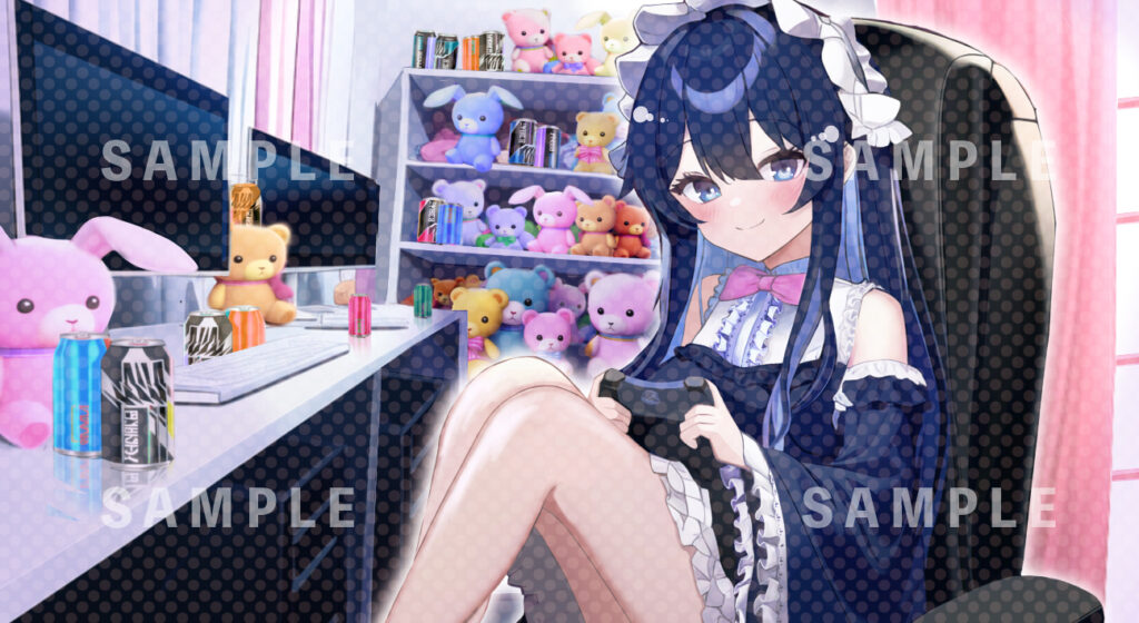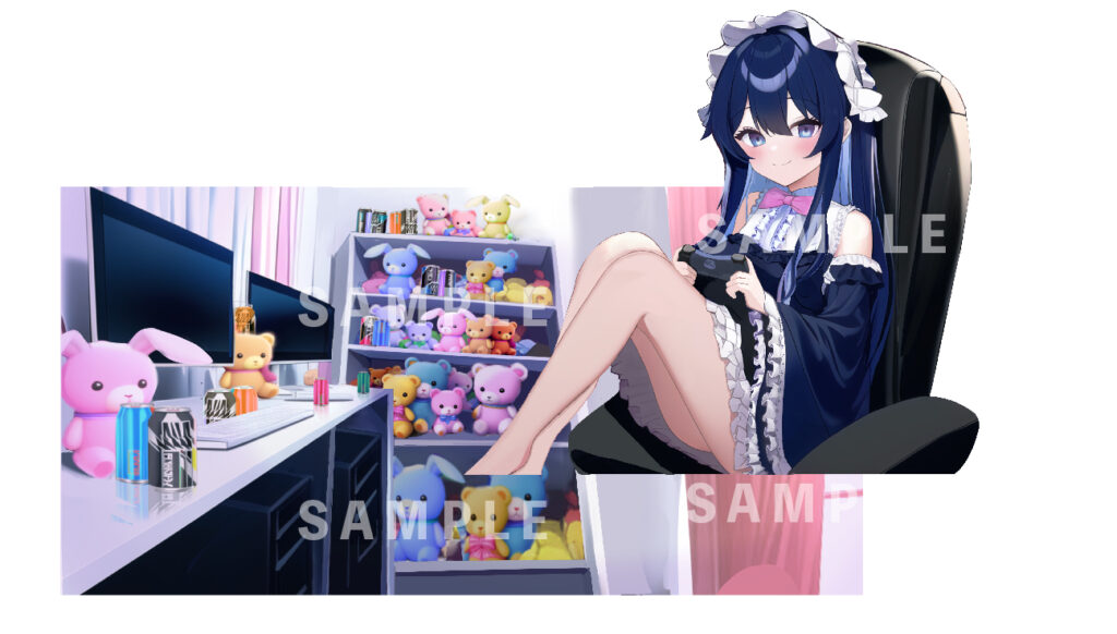 背景:女の子の可愛いお部屋、たくさんのぬいぐるみ、ゲーミングデスク、転がるエナドリ