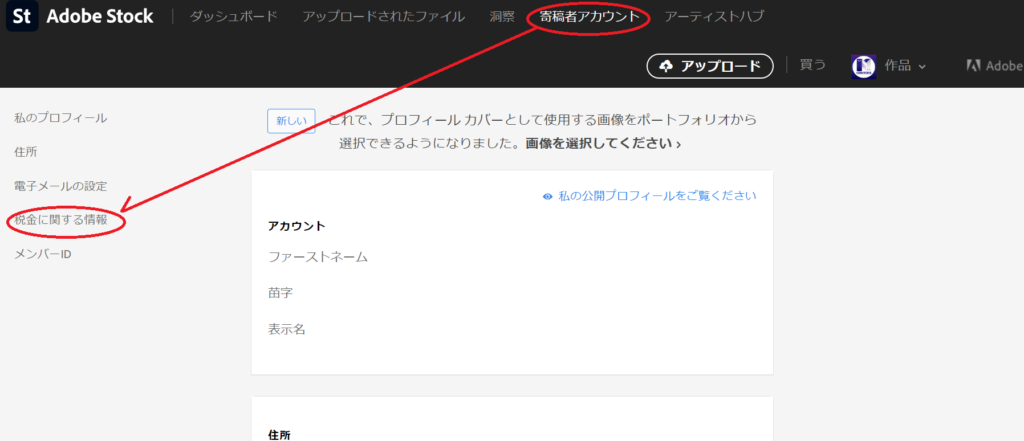 「寄稿者アカウント(コントリビューターアカウント)」→「税金に関する情報(タックス情報)」と進みます。