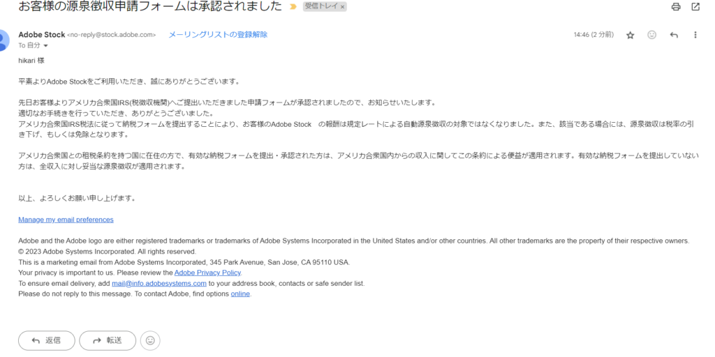 Adobe Stockから「提出済みのW-8納税フォーム、12月31日で期限が切れます」との件名のメールが届いたので対処しました。