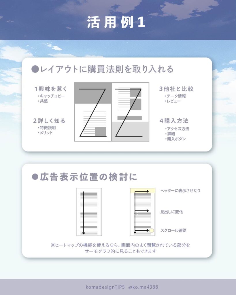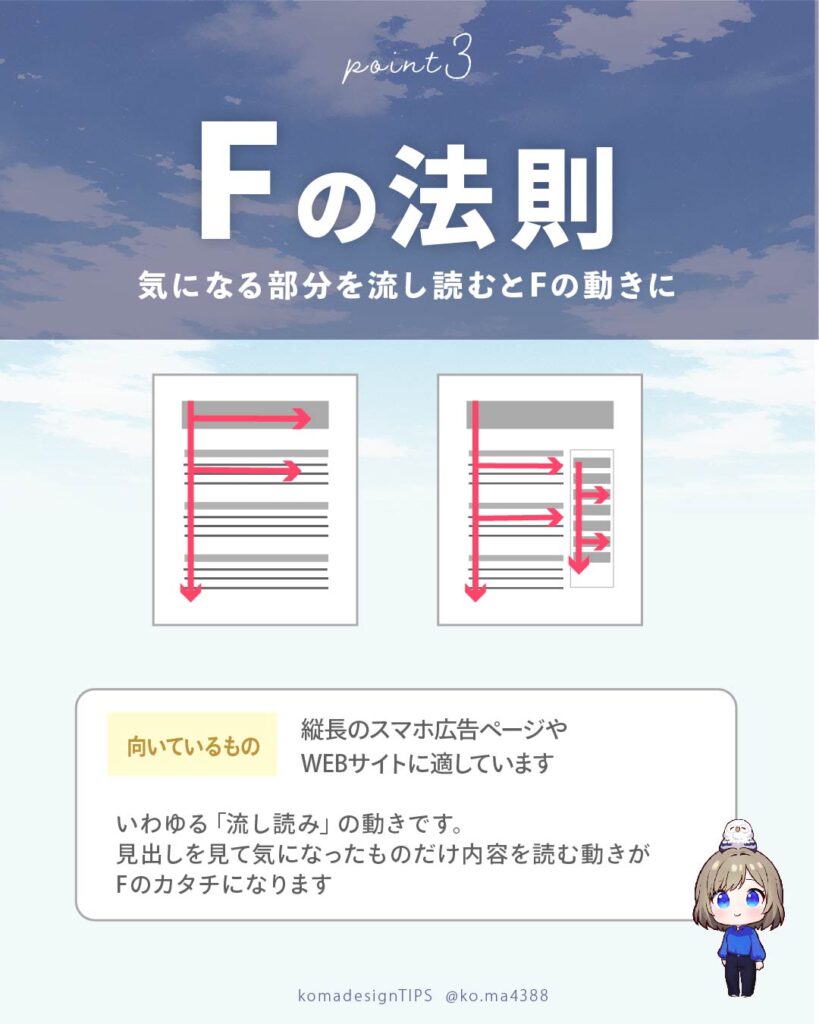 見慣れない形のサイトや、珍しいUIなどはこの視線の動きが最初に来るのでコンテンツの位置を考えて決めるのがおすすめです。