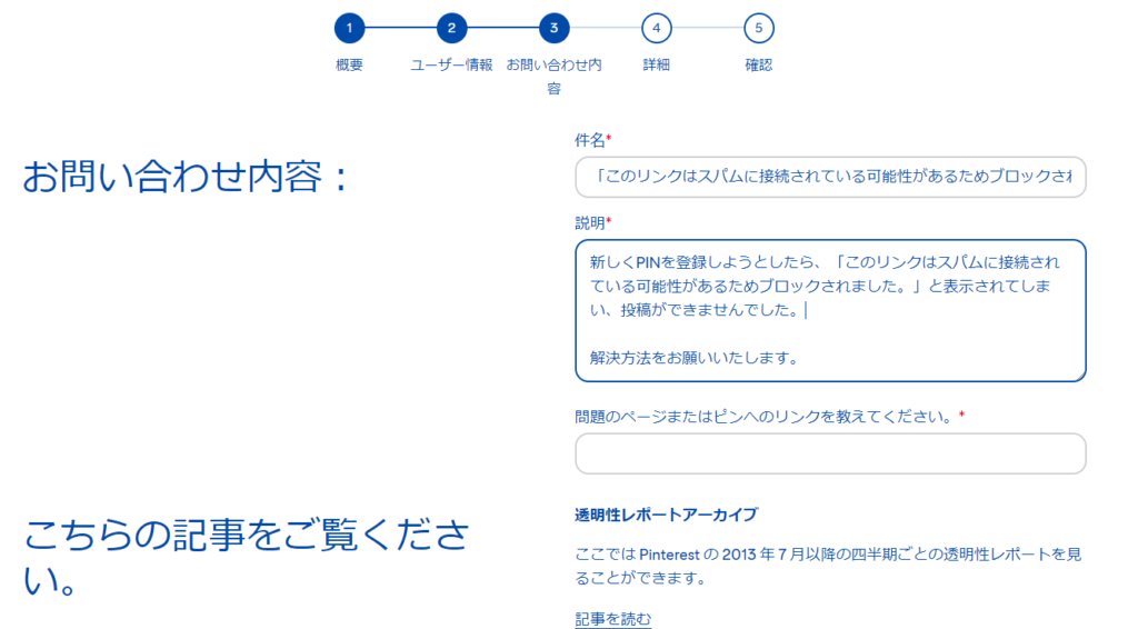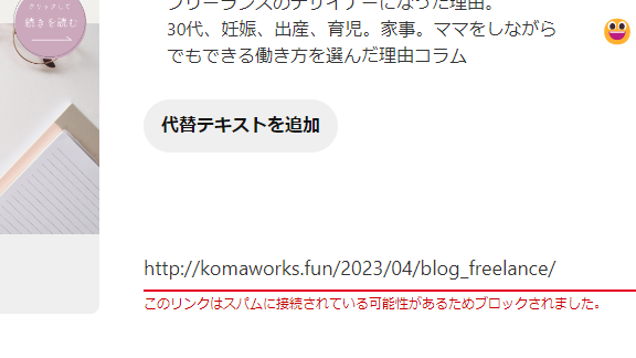 ピンタレストに投稿しようとしたら突然「このリンクはスパムに接続されている可能性があるためブロックされました。」と表示されてできなくなった。